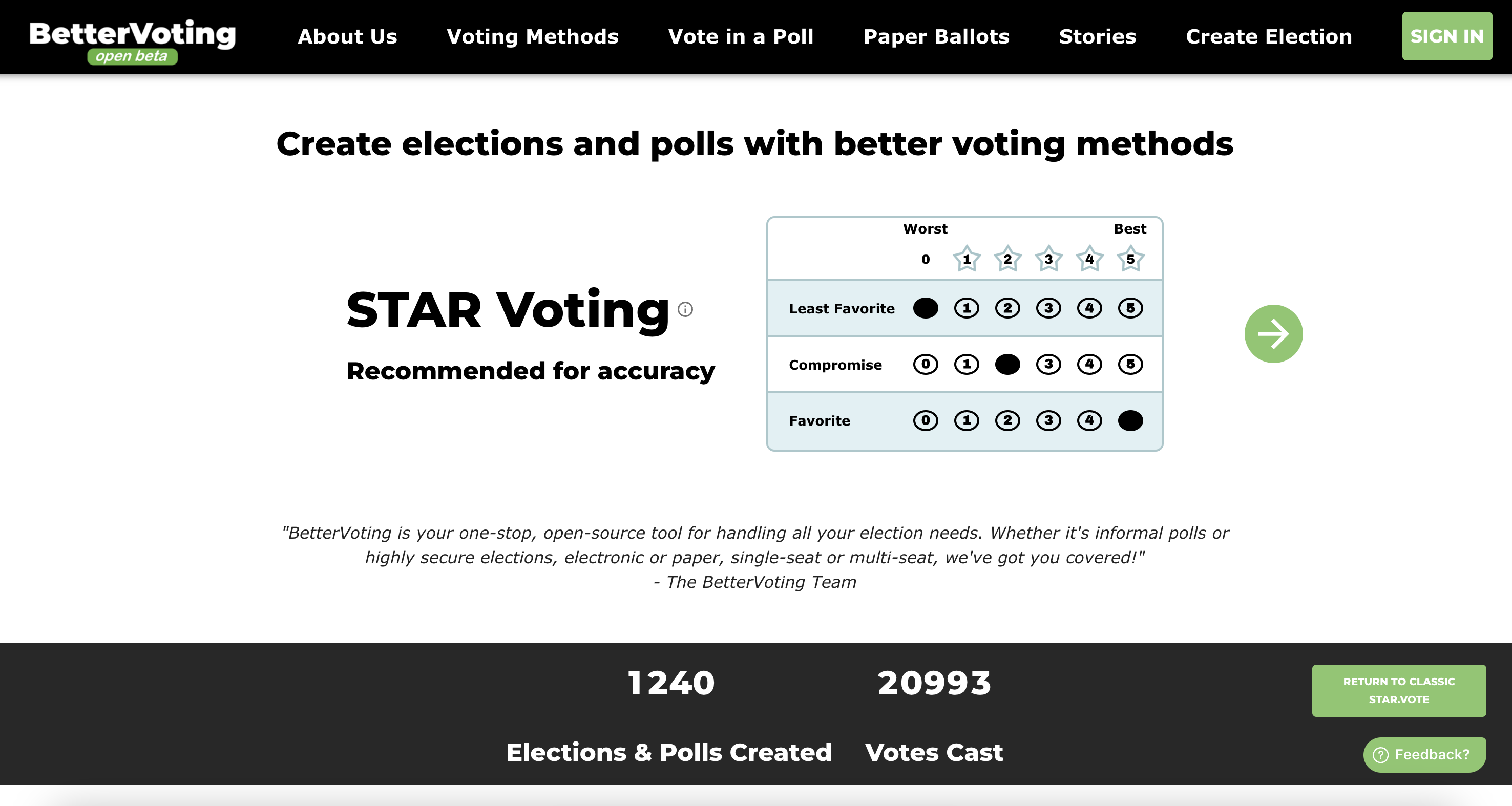 BetterVoting BetterVoting is here to help make your dream elections accessible to vote in and easy to officiate. Our mission is to support and empower the adoption and use of better voting methods like STAR Voting, for polling, surveys, and real elections at any scale and for any scenario. |